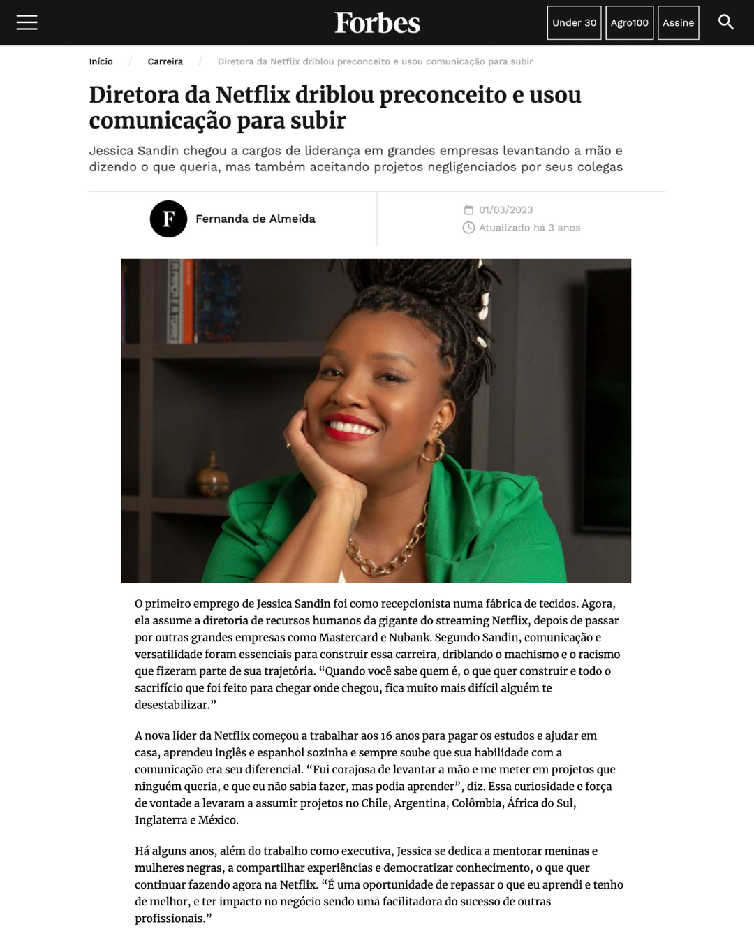 Executiva de RH, com 15 anos de experiência internacional em grandes multinacionais Forbes 500 (Netflix, Nubank, Mastercard, BASF). Formada em Relações Internacionais, com especializações em Liderança e Gestão de Carreira, vivência internacional na América Latina, Europa e África. Fluente em Português, Inglês e Espanhol.